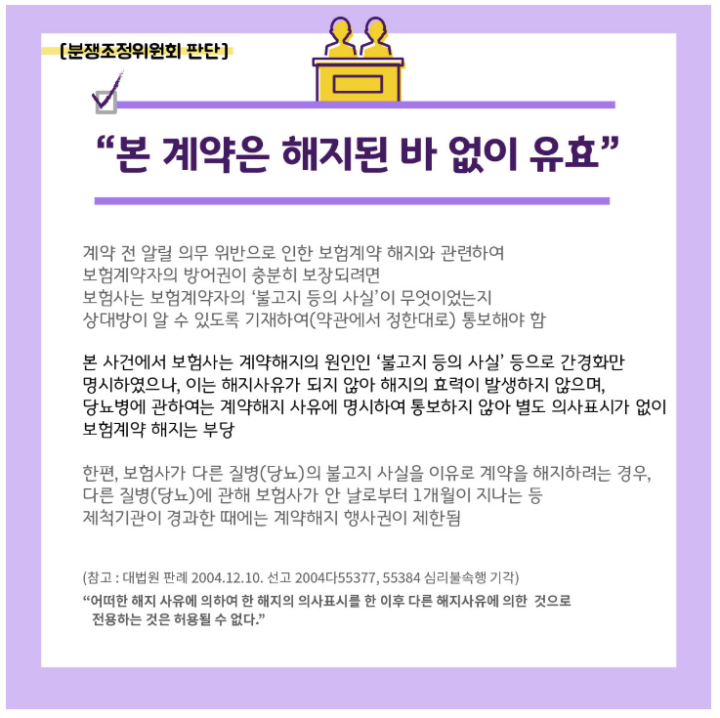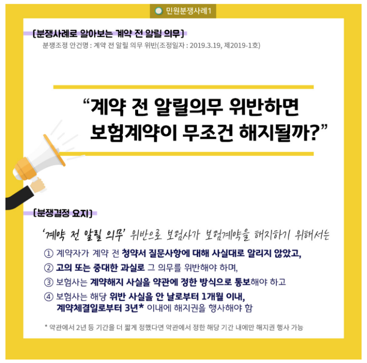 보험계약자와 보험사 간에 주로 분쟁이 발생하는 '보험계약 전 알림 의무 위반 시 보험계약이 무조건 해지 되는지?'에 대한 조정 사례가 있어 공유해 드리겠습니다.