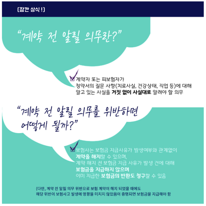 우리가 보험을 계약하기 위해서는 계약자 또는 피보험자가 청약서에 있는 질문사항(치료사실, 건강상태, 직업 등)에 대해 알고 있는 사실을 거짓없이 사실대로 보험사에게 알려야 할 의무가 있습니다.