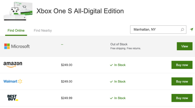 Xbox One S All-Digital Edition의 미국 가격은 249달러(한국 기준 30만 8000원)에 판매되고 있으며 Microsoft Online Store나 Amazon, Walmart, Bestbuy에서도 구매할 수 있습니다. 다만 아쉽게도 한국에서는 아직 출시되지 않아 해외에서 직접 구매해야 합니다.