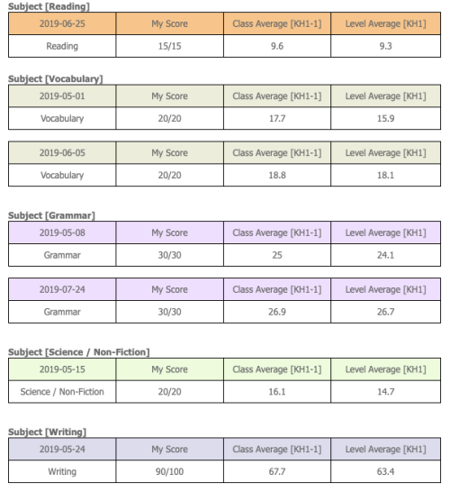 아들이 2년 동안 영어책을 매일 꾸준하게 읽은 결과 Reading 뿐만 아니라 Vocabulary, Grammar, Writing 및 Speaking도 상위 수준을 유지하고 있습니다.