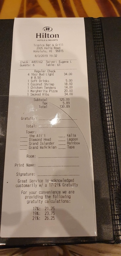 여기에 맥주 4잔과 소프트 드링크 1잔을 추가해서 나온 금액이 125달러, 거기에 TAX, Tip 21%(서빙 보시는 분이 너무 친절하게 대해 주셔서 21% 드림) 추가해서 156달러에 저녁식사를 마무리했습니다. 한 끼 먹는데 156달러(원화로 계산하면 약 18만 원)로 적은 금액은 아니지만 전반적인 맛은 그저 그랬습니다.