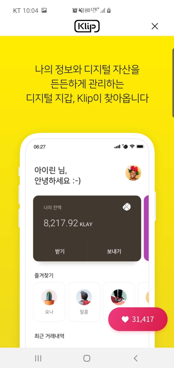 카카오는 카카오톡에서 더보기를 클릭하면 '클립'이라는 암호화폐 지갑 메뉴를 볼 수 있도록 서비스를 추가했습니다. 현재는 메뉴만 추가된 상태이고, 클립에 대한 소개 페이지만 볼 수 있는 상태인데 하반기 중으로 정식 서비스가 오픈될 예정입니다.