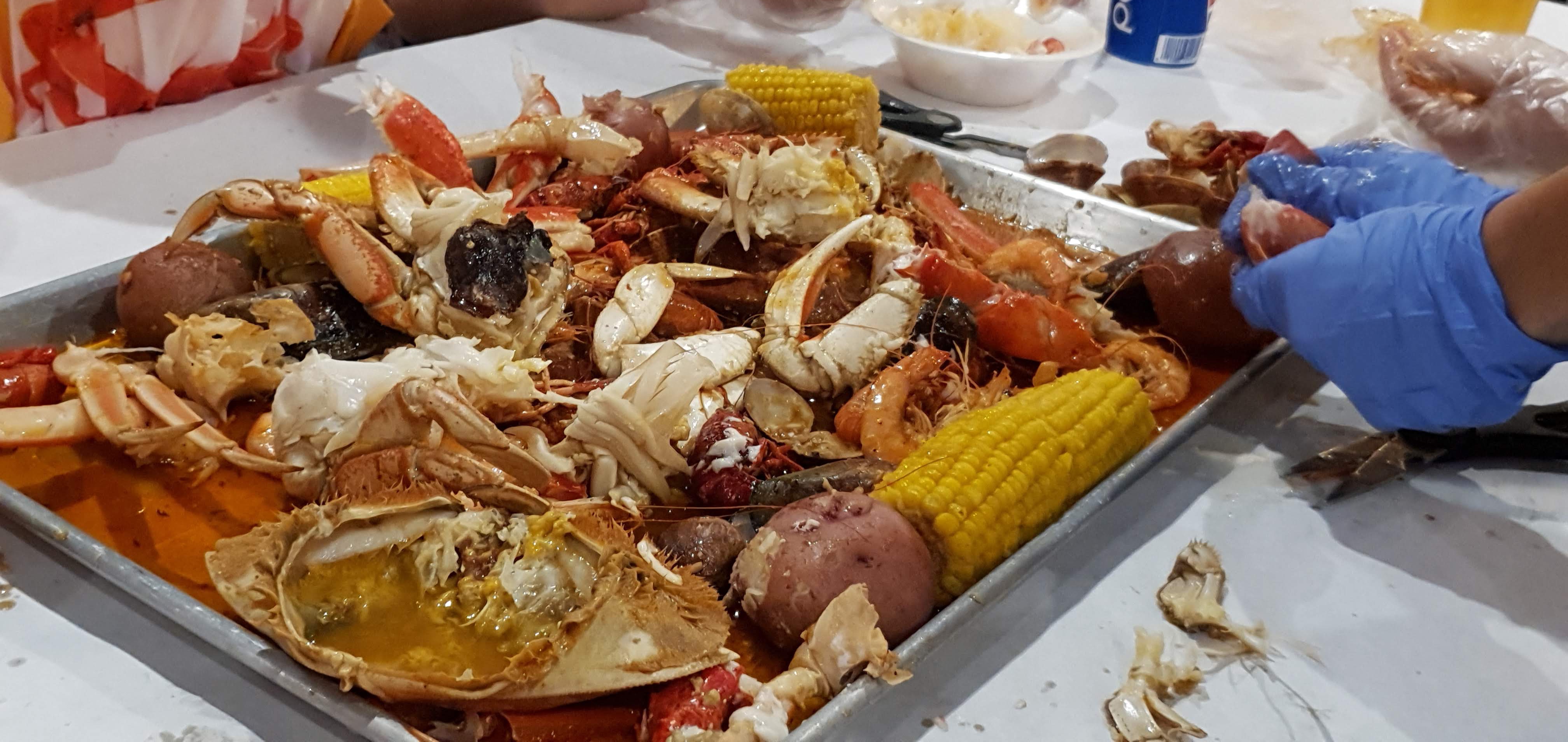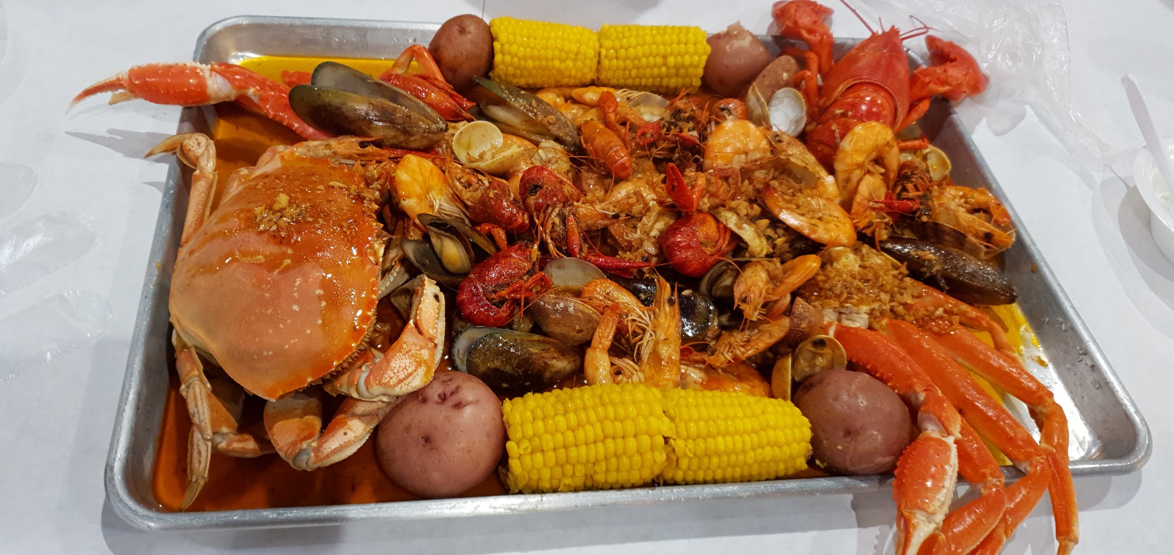 콤보 메뉴에는 크랩, 랍스터, 쉬림프, 조개, 옥수수, 감자, 소시지 등이 쟁반에 담겨 뜨겁게 쪄서 나오는데 우리가 처음 방문한 것을 아셨는지 직원분이 먹기 좋게 손질을 해주셨습니다. 우리는 앞치마를 두르고, 양손에는 비닐장갑을 끼고 열심히 크랩이나 랍스타를 먹은 후에 추가로 공기밥을 주문해서 먹었습니다.