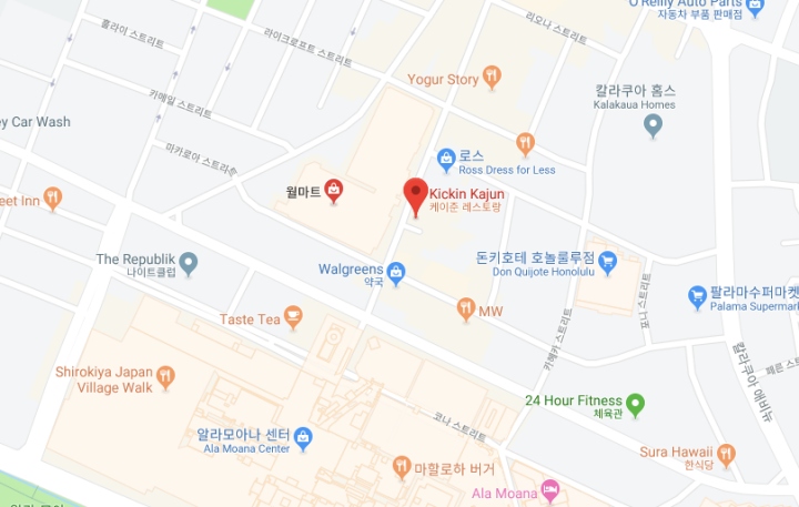 지도를 검색해 보니 키킨 케이준(Kickin Kajun)은 하와이 여행 첫날에 갔었던 알라모아나 쇼핑센터 뒤쪽에 있는 월마트 바로 건너편에 위치해 있어서 저녁식사를 하고, 월마트 가서 여행 선물을 사기로 했습니다.(하와이에는 키킨 케이준이 카폴레이 쪽에도 있으니 참고하세요)