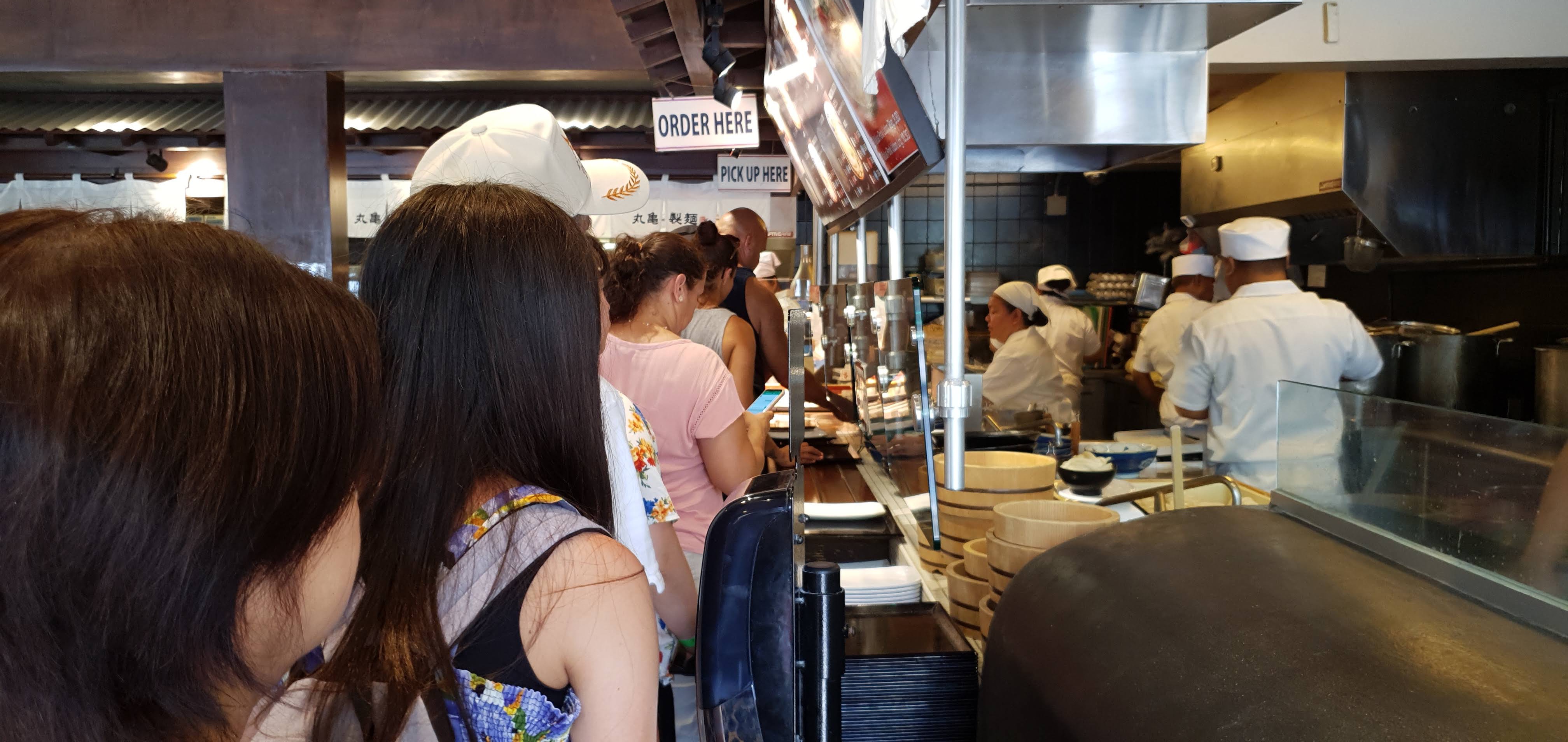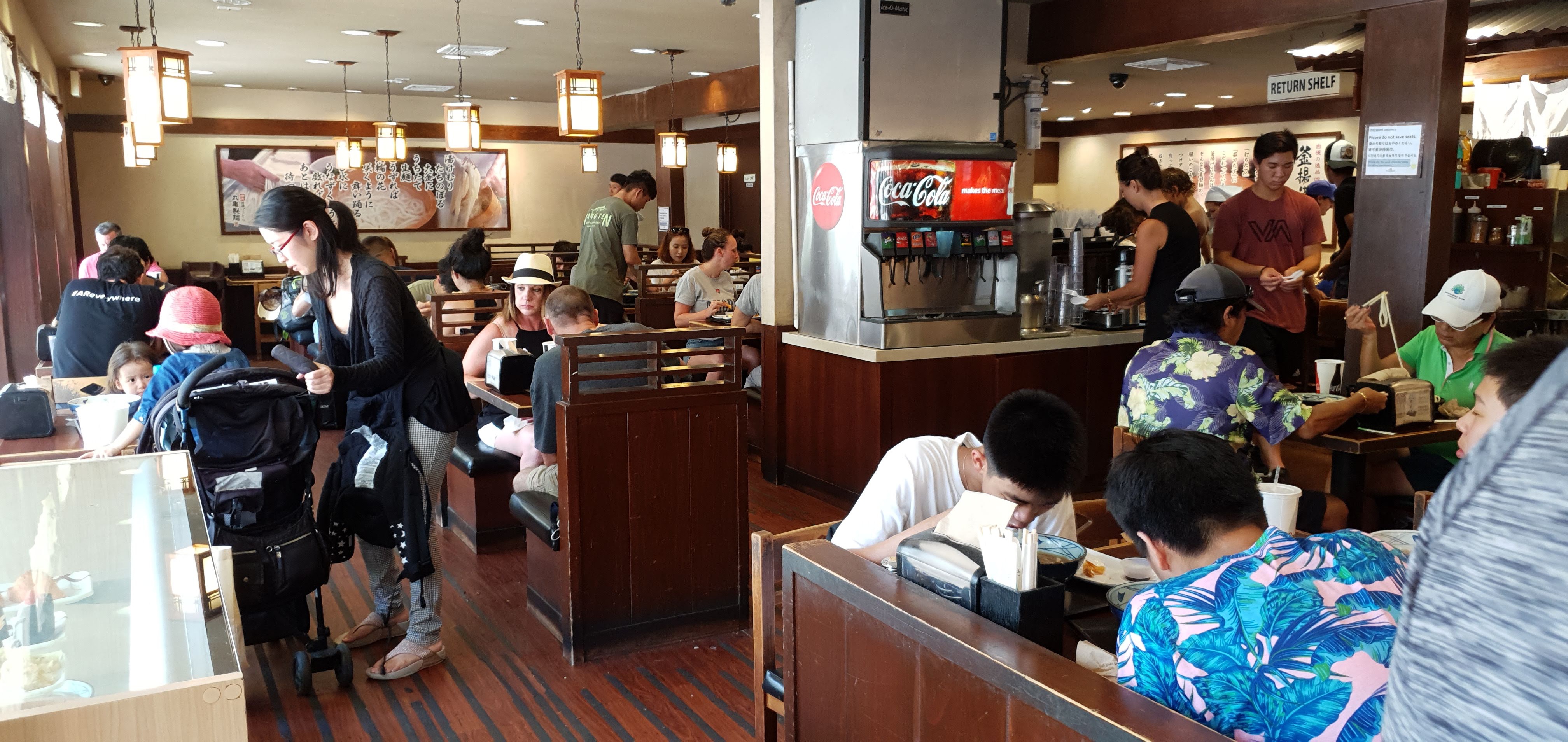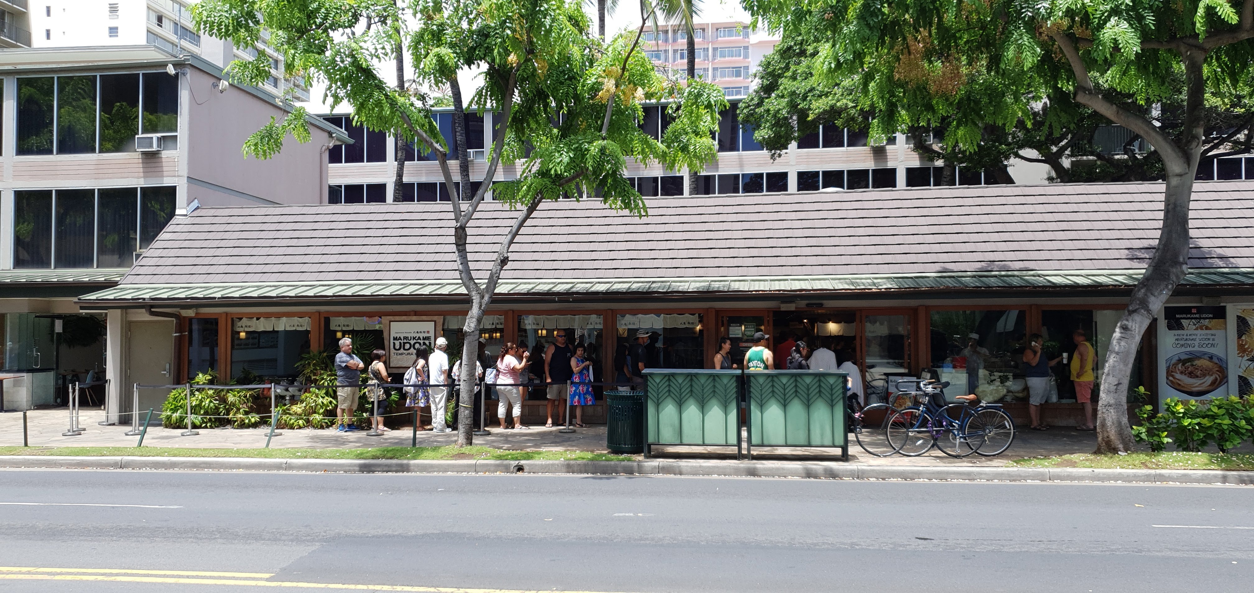 와이키키에 도착한 우리는 아들이 좋아하는 면을 먹기 위해 마루카메 우동 집으로 향했습니다. 아들은 일본제품 불매운동 중이라 살짝 고민했지만 그래도 하와이에 오면 와이키키 맛집인 마루카메 우동은 꼭 먹어봐야 한다고 해서 어렵게 선택을 했습니다. 마루카메 우동 집에 도착해서 보니 소문에서 듣던 바와 같이 점심시간이 조금 지난 시간임에도 불구하고 많은 사람들이 줄을 서서 기다리고 있었습니다.