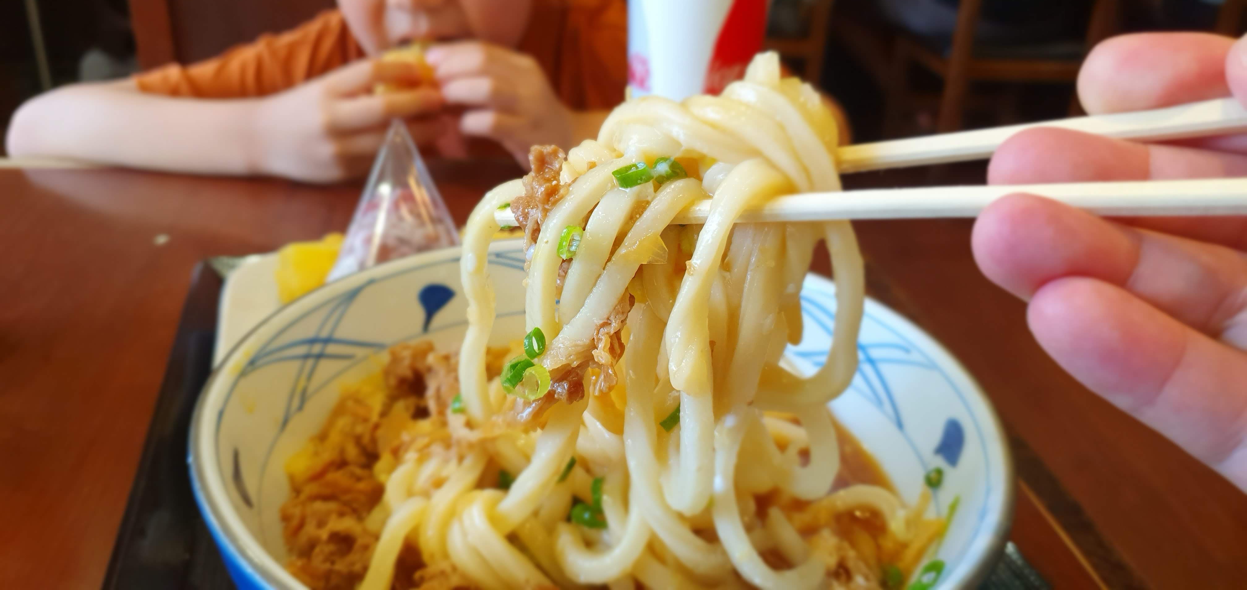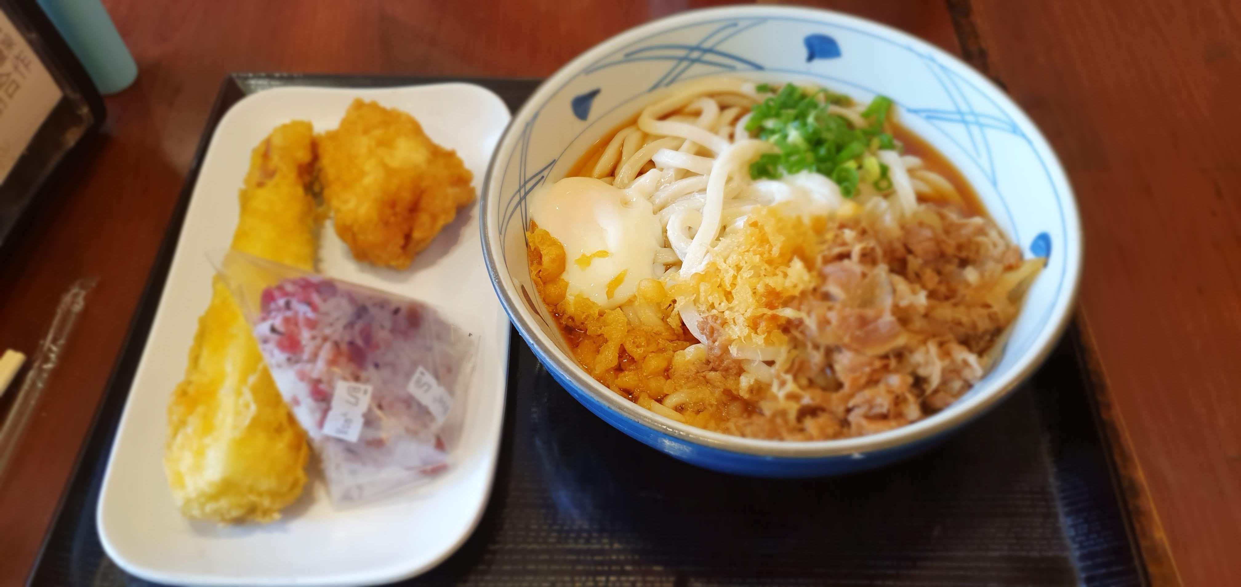 우리는 식당 입구에 있는 메뉴판을 보고, 니쿠타마 우동과 튀김, 그리고 일본식 김밥인 무수비를 먹기로 했습니다. 주문 시스템은 의뢰로 간단했습니다. 메뉴판을 보고 먹고 싶은 메뉴에 해당하는 숫자를 종업원에게 불러주면 바로 우동을 만들어 줍니다. 그다음에 먹고 싶은 튀김과 무수비를 선택해서 접시에 담으면 마지막에 종업원이 보고 계산을 해줍니다. 우동은 냉우동과 온우동, 보통과 곱빼기로 구분해서 주문하실 수 있습니다.