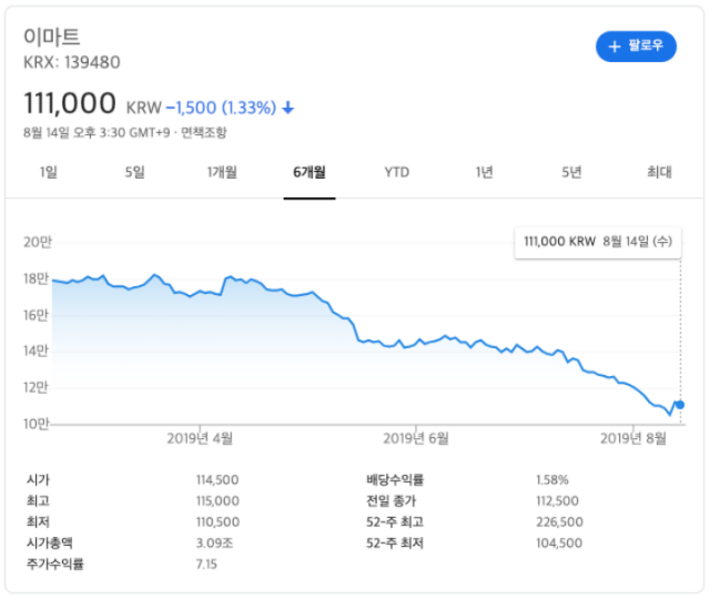 이렇다 보니 이마트가 1년 이내에 갚아야 할 부채는 급증하고 있는 반면 현금은 턱없이 부족한 것으로 알려졌습니다. 이러한 위기 상황을 반영이라도 하듯이 이마트의 주가는 6개월 사이에 7만 원 정도가 하락했습니다.