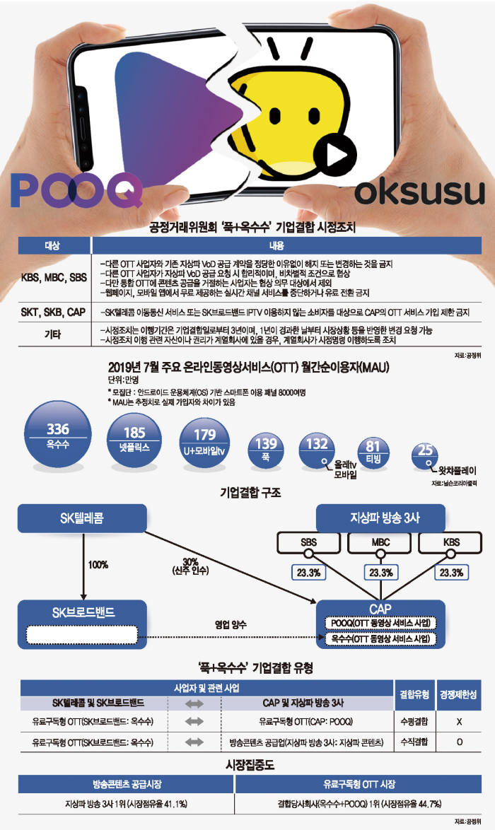 이러한 위기를 극복하기 위해 옥수수(oksusu)를 서비스하고 있는 SK텔레콤(실제는 SK브로드밴드가 서비스 제공자이나 SKT가 SKB의 지분을 100% 보유)과 푹(pooq)을 서비스하고 있는 지상파 3사가 공동 출자해서 설립한 콘텐츠연합플랫폼(CAP)은 기업결합을 통해 통합 OTT 서비스인 웨이브를 출시하여 넷플릭스나 유튜브, 디즈니 플러스 같은 글로벌 OTT 서비스 사업자에 대응하기로 했습니다.