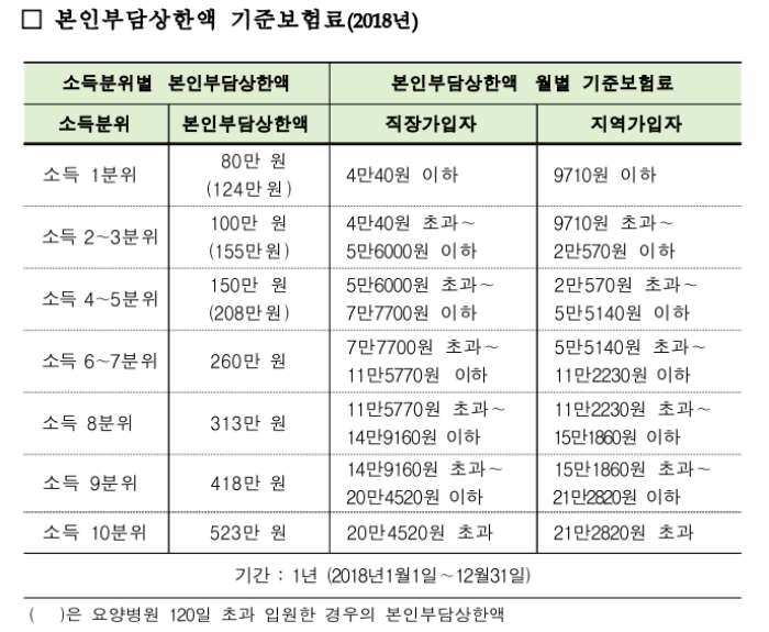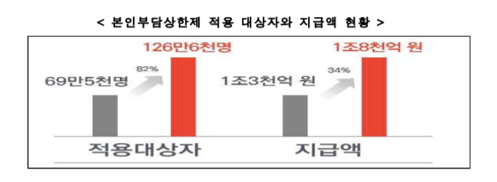 2018년도 본인부담상한제 적용 대상자와 지급액은 2017년 대비 각각 57만 명(82.1%), 4566억 원이 증가한 것으로 나타났습니다.