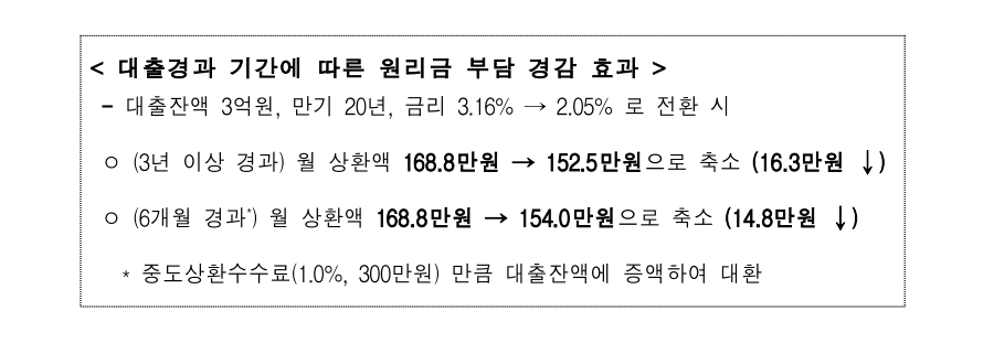 최근 은행의 주택담보대출 금리가 계속 하락하는 추세이기는 하나 서민 실수요자의 주택금융 비용부담 경감을 위해 출시된 정책모기지로 저금리 대환이라는 측면과 장기간 현 수준으로 금리가 고정되는 측면을 고려하여 면밀히 따져보시고 '서민형 안심전환대출'로 갈아타시기 바랍니다.