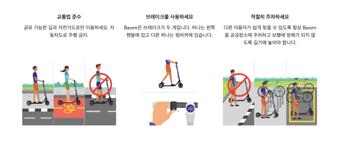 Beam은 서울에서 24시간 서비스를 제공하고 있습니다. 서비스 초기에는 아침 7시, 저녁 8시까지만 운영을 했는데 8시 이후에도 공유 전동킥보드를 타는 사람들이 많아지면서 24시간으로 서비스를 확대했습니다. 또, 다른 전동킥보드 공유 서비스 업체가 첫 잠금해제 비용을 천원 정도 받은 것과 달리 빔은 단거리 주행을 원하는 이용자들에 초점을 맞춰 기본요금을 600원으로 낮추고, 분당 이용료를 180원으로 책정했습니다. 여기에 지정된 주차구역에 전동킥보드를 반납하면 600원을 환불해 주거나 충전자 모델 등을 도입하여 서비스 차별화를 꾀하고 있습니다.