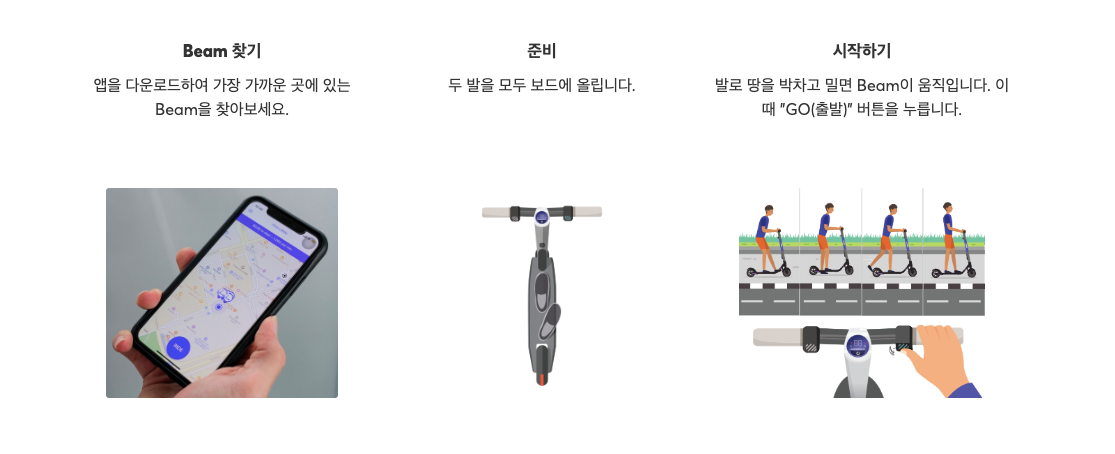 Beam은 한국에서 전동킥보드를 활용하여 마이크로 모빌리티 운송 서비스를 제공하는 아시아 최초의 기업입니다. Beam은 한국 외에도 호주 애들레이드, 뉴질랜드 크라이스트처치 및 말레이시아 쿠알라룸프르에서 전동킥보드 공유 서비스를 운영하고 있으며 싱가포르와 대만 타이베이에서도 시범 서비스를 제공하고 있습니다.