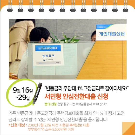 기존 변동금리나 준고정금리 주택담보대출을 최저 연 1%대 장기 고정금리로 갈아탈 수 있는 서민형 안심전환대출을 출시합니다. 2019년 7월 23일 이전 시행된 주택담보대출을 대상으로 부부합산 연소득 8500만 원 이하인 경우에만 신청이 가능하며 은행 창구 또는 주택금융공사로 신청하시면 됩니다.