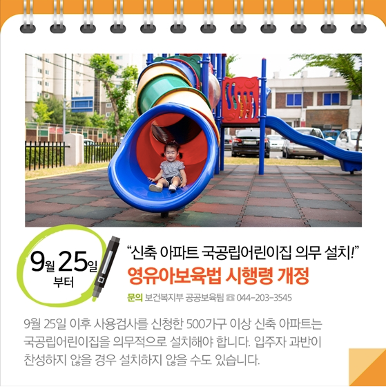 9월 25일 이후 사용검사를 신청한 500가구 이상 신축 아파트는 국공립어린이집을 의무적으로 설치하도록 영유아보육법 시행령이 개정 시행됩니다. 다만, 입주자 과반이 찬성하지 않을 경우 설치하지 않을 수도 있습니다.