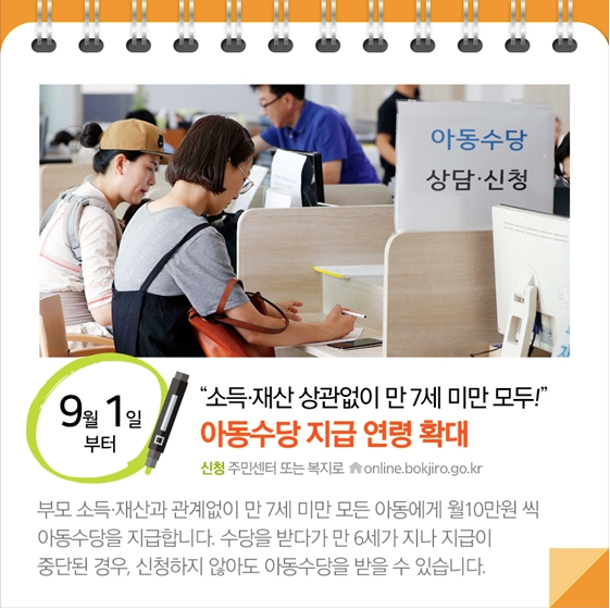 9월부터 아동수당 지급연령이 만 7세로 확대되는 등 일부 정책이 변경 시행된다고 합니다. 관련이 있으신 분들은 참고하시기 바랍니다.