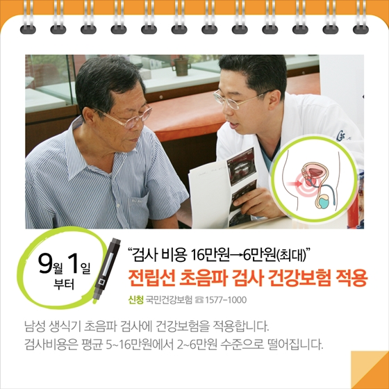 남성 전립선 초음파 검사에 건강보험을 적용합니다. 이에 따라 검사비용이 평균 5~16만 원에서 2~6(최대) 만원 수준으로 떨어집니다.