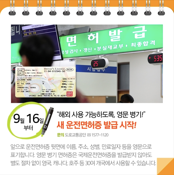 운전면허증 뒷면에 이름, 주소, 성별, 만료일자 등을 영문으로 표기한 새운전면허증을 9월 16일부터 발급합니다. 영문 병기 면허증은 국제 운전면허증을 발급받지 않아도 별도 절차 없이 영국, 캐나다, 호주 등 30여 개국에서 사용할 수 있습니다.