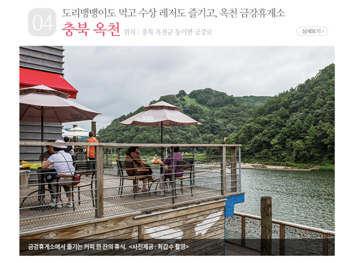 충북 옥천에 위치한 금강휴게소는 휴게소 뒤쪽으로 유유히 흐르는 금강이 여느 전망대보다 아름다운 풍경을 자랑하는 것으로 유명합니다. 휴게소에서 금강 변으로 내려가는 계단이 있고, 차를 이용해 외부 도로를 따라 내려가 낚시와 수상스키도 즐길 수 있습니다.