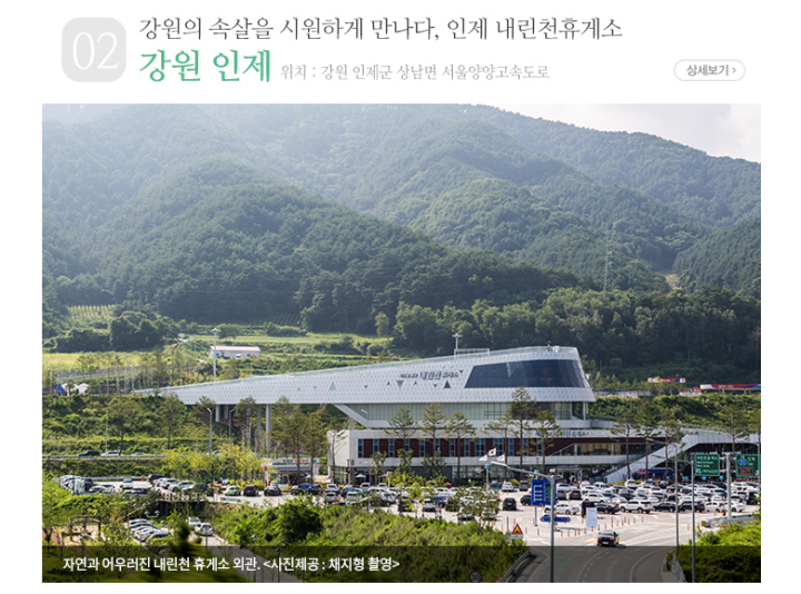 강원도의 아름다움을 만끽하기 좋은 곳이 인제 내린천휴게소입니다. 'V자형' 건물에 국내 최초 상공(上空)형 휴게소인 내린천휴게소는 내부 인테리어와 외부 디자인도 독특한 것으로 유명합니다. 휴게소 안에서 유리창을 통해 강원도의 아름다운 산세를 감상하고, 옥상 전망대에서는 깨끗한 공기와 함께 강원의 자연을 온몸으로 누릴 수 있습니다.