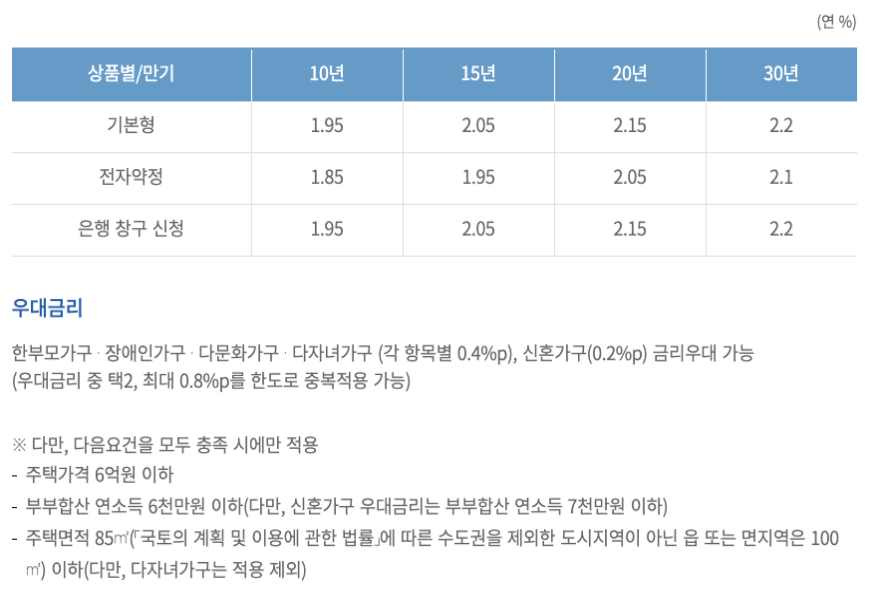 신청방법은 영업시간 중에 기존 대출은행의 영업점을 방문하시거나 주택금융공사 애플리케이션 '스마트 주택금융'을 통해서도 가능합니다. 특히, KEB하나은행, 신한은행, 우리은행, KB국민은행, 부산은행은 전자약정을 이용하실 경우 우대금리 혜택을 받으실 수 있습니다.