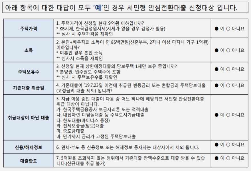서민형 안심전환대출에 필요한 핵심 체크리스트의 각 항목에 대하여 모두 '예'에 해당하는 경우 신청대상에 해당합니다. 각 항목별 세부사항에 대해서는 아래 상세 설명을 참조하시기 바랍니다.