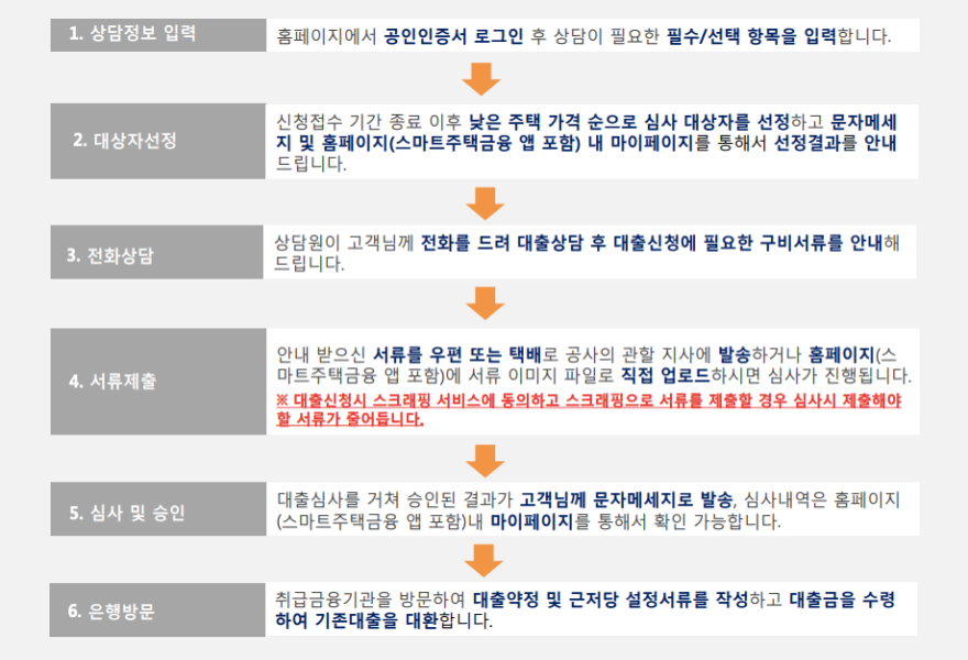 서민형 안심전환대출 신청은 주택금융공사 홈페이지에서 공인인증서 로그인 후 상담에 필요한 필수 및 선택항목을 입력하면 신청접수 기간이 종료된 후 낮은 주택 가격 순으로 심사 대상자를 선정하여 전화상담을 진행합니다. 이후 대출신청에 필요한 서류제출이 완료되면 심사 후 승인되면 취급 은행을 방문하여 대출금을 수령하여 기존 대출을 대환하면 됩니다.