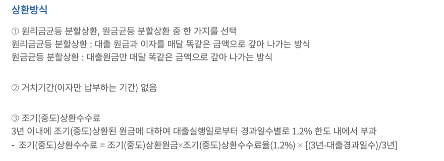 이자만 납부하는 거치기간은 없으며 3년 이내에 조기 상환 시 중도 상환된 원금에 대하여 대출실행일로부터 경과일수별로 1.2% 한도 내에서 수수료가 부과됩니다.