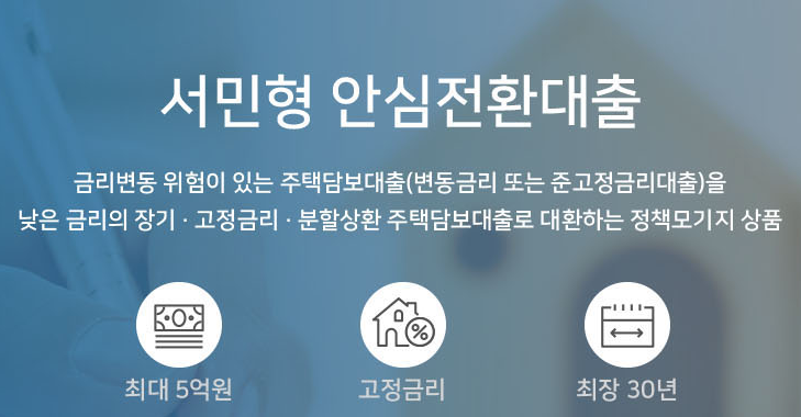 서민형 안심전환대출은 금리변동 위험이 있는 주택담보대출(변동금리 또는 준고정금리대출)을 낮은 금리의 장기, 고정금리, 분할상환 주택담보대출로 대환 하는 정책모기지 상품으로 최대 5억 원까지 최대 연 1%대 고정금리로 최장 30년까지 대출을 받을 수 있습니다.