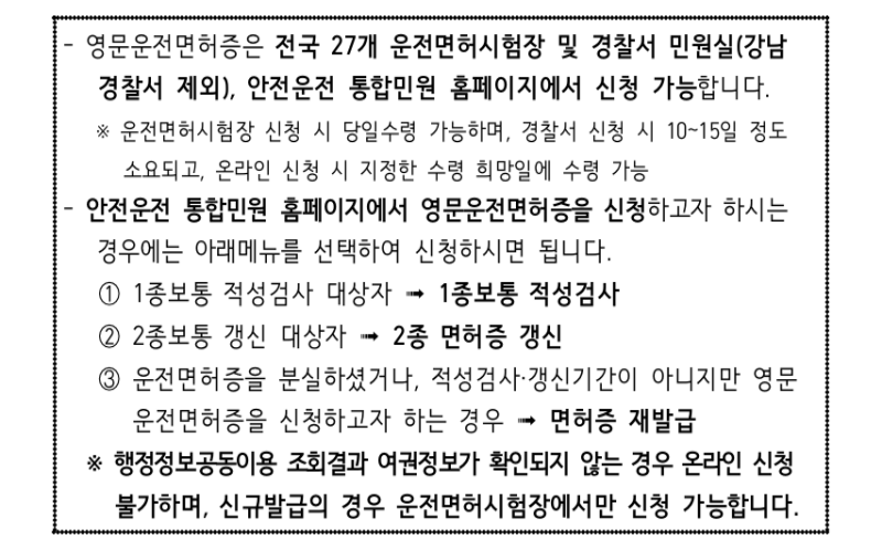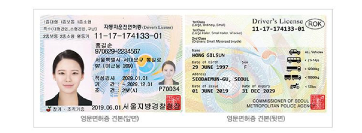영문 운전면허증은 도로교통법 시행규칙 제78조를 근거로 해외여행이나 출장 등으로 해외에서 운전을 해야 하는 경우 사용 편의성을 위해 운전면허증 뒷면에 성명과 생년월일, 면허번호, 운전 가능한 차종 등 면허정보가 영문으로 표기한 운전면허증입니다.