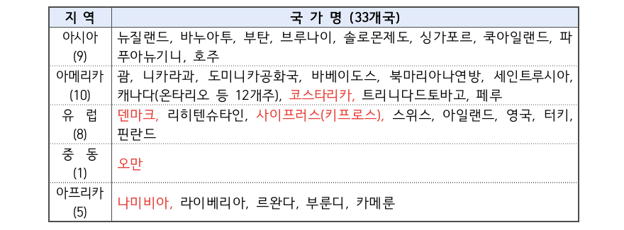 영문운전면허증 만으로 운전이 가능한 국가는 뉴질랜드, 싱가포르, 호주, 괌, 캐나다, 코스타리카, 페루, 덴마크, 스위스, 아일랜드, 영국, 터키, 핀란드, 오만, 르완다, 카메룬 등을 포함한 33개국입니다. 이들 국가는 영문운전면허증 사용 시 별도의 번역공증 없이 운전이 가능한 국가를 의미하며 해당 국가의 상황에 따라 별도 요구서류가 있을 수 있으니 유의하시기 바랍니다.
