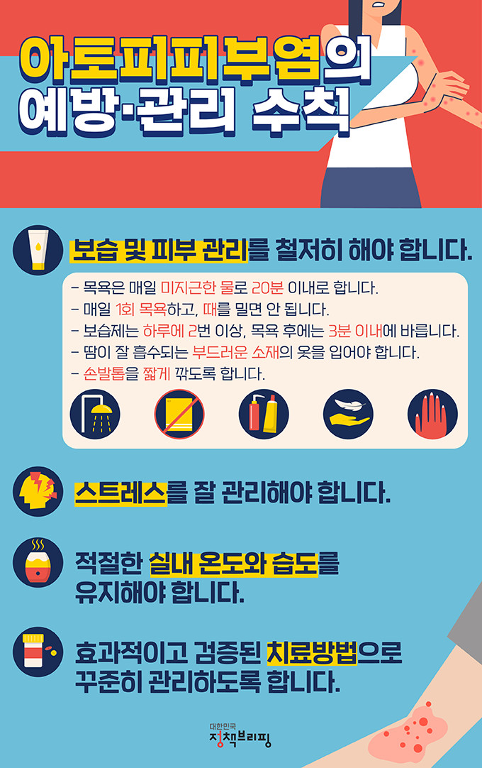 목욕 후 부드러운 수건으로 두드리듯 물리를 닦아주고, 3분 이내에 보습제를 충분히 바르는 것이 좋습니다. 보습제는 약물이 아니므로 부작용을 걱정할 필요는 없으며 하루에도 여러 번 사용하고, 정상적인 피부를 포함한 전신에 사용합니다. 또, 피부 상태가 좋아졌다고 하여 사용을 중단하지 말고 지속해서 사용하는 것이 중요하다고 합니다.