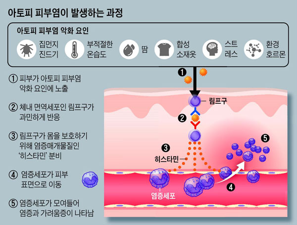 성인 아토피는 음식과는 거의 관련성이 없고, 집먼지진드기 등의 호흡기 알레르기 유발물질이나 음주, 흡연, 과로나 업무 스트레스 등으로 신체의 면역력이 떨어지는 것과 관련성이 높다고 합니다.