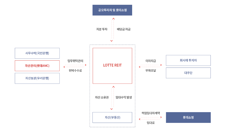 이번에 상장 예정인 롯데리츠는 롯데쇼핑이 지급하는 공정 임차료를 기반으로 투자자에게 공모가의 연 6.3%~6.6% 내외에 해당하는 배당수익을 제공할 계획입니다. 롯데쇼핑이 연간 고정 임대료 상승률 1.5%가 적용된 확정 임차료를 지불하는 만큼 공실 리스크가 없고, 제세금과 관리비용까지 부담하게 돼 투자자들은 안정적인 배당수익을 얻을 수 있는 것이 가장 큰 장점입니다.