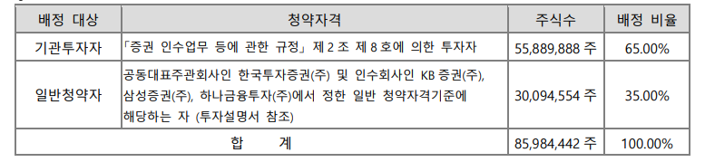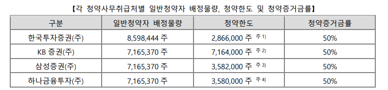 하나금융투자는 우대고객은 716만주까지 청약할 수 있으며 일반 고객은 우대고객의 50% 물량까지 청약할 수 있습니다.