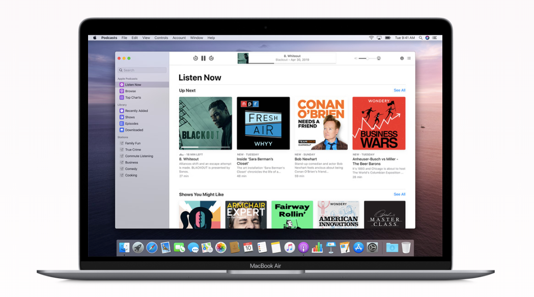 애플 맥OS 카탈리나에서는 Apple Music 앱 외에도 Apple Podcasts도 새롭게 선보입니다. 이에 따라 맥에서 팟캐스트 앱으로 최신 엔터테인먼트, 코미티, 뉴스 및 스포츠 방송 등을 시청할 수 있습니다. 팟캐스트 검색 기능을 통해 제목, 주제, 출연진, 진행자, 내용 등을 검색해서 구독을 하면 새로운 에피소드가 나왔을 때 바로 알림을 받아 볼 수도 있습니다. 또, '지금 듣기' 탭을 통해 애플 아이폰이나 아이패드 등 모든 기기에서 마지막에 멈췄던 지점부터 바로 이어서 시청할 수도 있습니다.