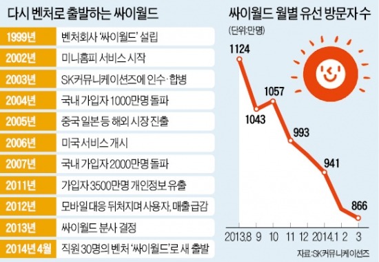 그러나 싸이월드는 2003년 SK커뮤니케이션에 인수 된 후 변화보다는 안정을 택한 경영전략으로 쇠락하기 시작하다가 2009년 국내에 아이폰이 출시되면서 PC에서 모바일 환경으로 변화하는 시대의 흐름을 타지 못한 체 내리막 길을 걷게 됩니다.