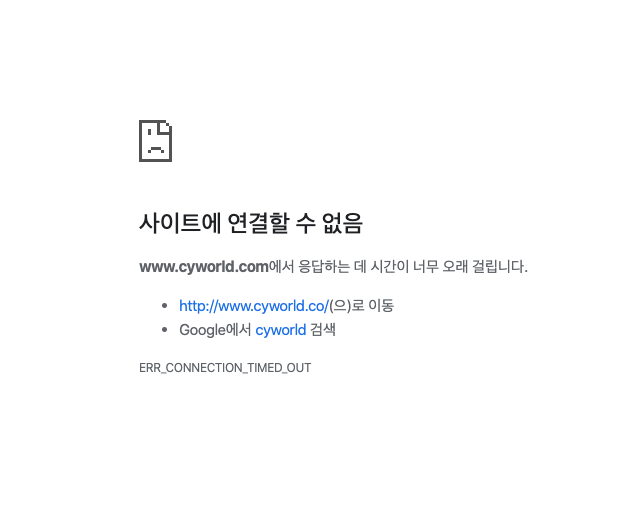 10월 11일부터 싸이월드와 클링 홈페이지는 접속 장애 현상을 보이고 있습니다. 싸이월드와 클링 홈페이지에 접속하면 '사이트에 연결할 수 없음' 라는 문구만 나오고 페이지가 열리지 않습니다.