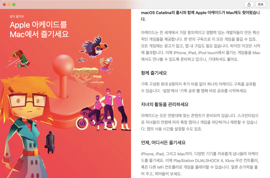 애플은 지난 9월 20일 월정액 게임 구독 서비스인 '애플 아케이드'를 국내에 출시했으며 애플 맥OS 카탈리나로 업데이트를 하면 애플 iMAC이나 MacBook, MacBook Air나 iPad, iPhone 등 다양한 애플 디바이스에서 게임을 즐길 수 있도록 했습니다.