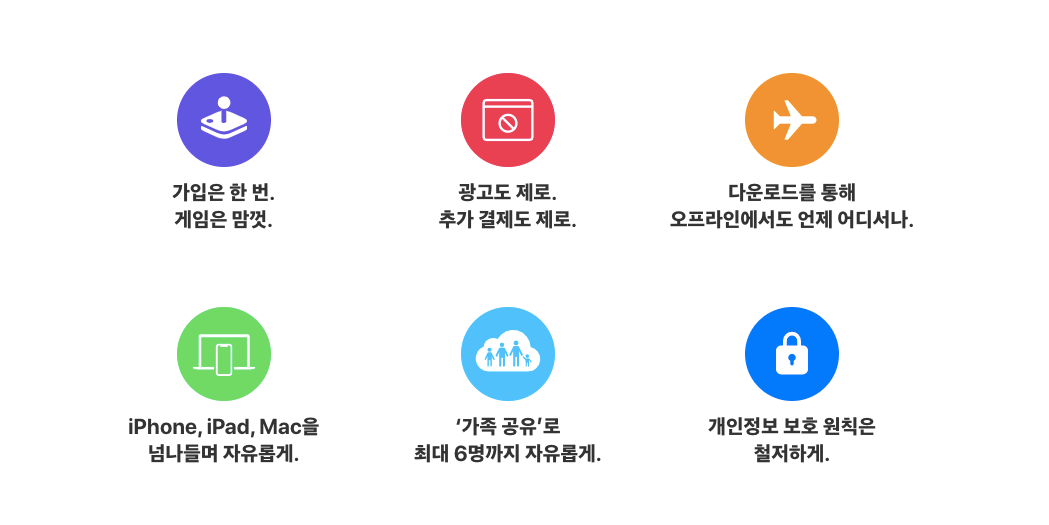 애플 아케이드는 월 6500원에 최대 6명까지 접속하여 100개 이상의 신작 게임을 자유롭게 내려받아 즐길 수 있는 구독형 서비스로 번거롭게 광고를 보거나 추가 결제를 하지 않아도 되는 장점이 있습니다.