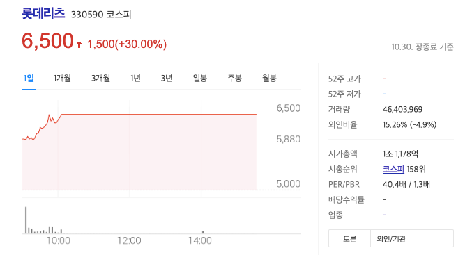 공모 리츠 상장 회사 중에 사상 최대 청약 경쟁률을 기록했던 롯데리츠 주가가 상장 첫날 공모가 겸 기준가(5000원) 대비 30% 오른 상한가를 기록했습니다.