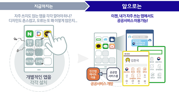 그동안 정부가 직접 운영하는 누리집과 앱에서만 가능했던 민원신청 및 신고 등의 공공서비스를 국민들에게 친숙한 민간 앱, 포털 등에서 이용할 수 있게됩니다. 이를 위해 공공서비스를 오픈 API 방식으로 민간에 개방해 혁신적인 디지털 서비스 모델이 민간에서 지속적으로 창출될 수 있도록 지원할 방침입니다.