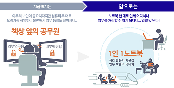 공무원 1인당 2대씩 이용하는 컴퓨터를 1대의 노트북으로 교체하고, 보안대책을 마련해 사무실은 물론 이동, 출장 중에 자유롭게 활용할 수 있도록 공무원의 일하는 방식에도 혁신을 가할 계획입니다.