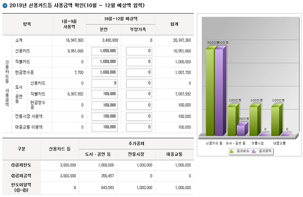 근로자가 홈텍스에서 1∼9월 신용·직불·선불카드 등의 사용처별 결제액을 확인해 10∼12월 사용 예정액과 총급여를 추가로 입력하면 공제 금액과 예상세액이 자동 계산되며 지난해 연말정산한 금액으로 미리 채워놓은 각 항목의 공제 금액을 수정 입력하면 예상세액을 계산해 볼 수도 있습니다.