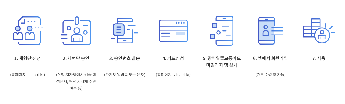 광역알뜰교통카드 사용절차는 홈페이지(http://alcard.kr)에서 체험단을 신청하면 해당 지자체에서 미성년자인지와 해당 지자체 주민 여부 등을 확인한 후 카카오 알림톡이나 문자로 승인번호를 발송해 줍니다.