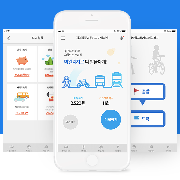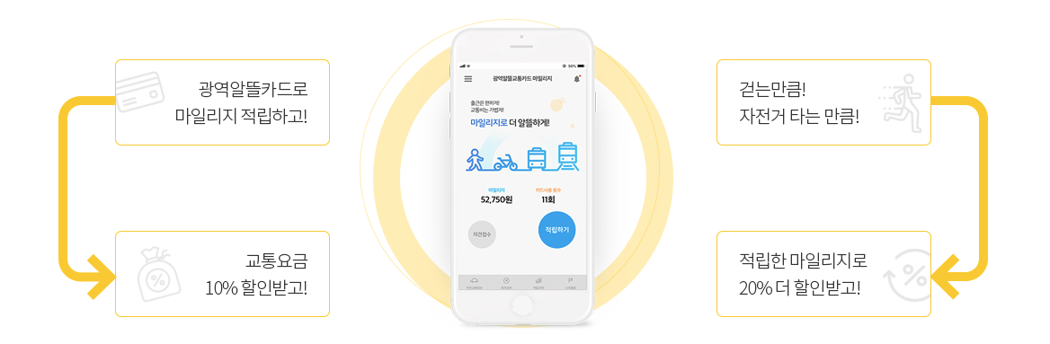 광역알뜰교통카드는 대중교통 이용 전후로 걷거나 자전거로 800m를 이동하면 마일리지를 주고, 이 마일리지로 최대 30% 대중교통 요금을 할인받을 수 있는 카드로 편리한 대중교통 플랫폼(App)을 통해 개인 맞춤형 교통 · 환경· 건강 등의 정보를 제공받을 수 있습니다.