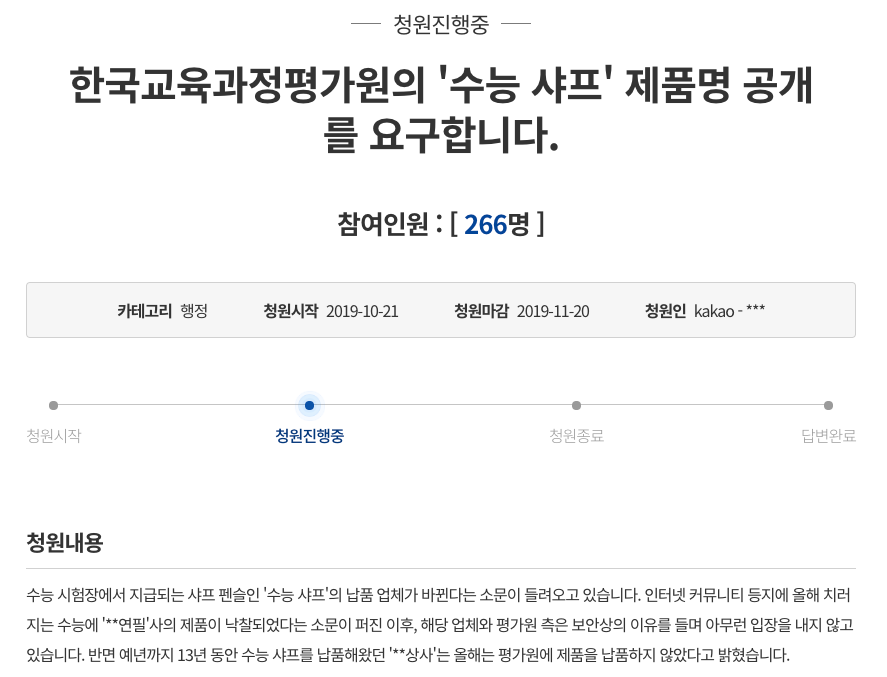 이런 수험생들의 불안감은 2020학년도 수능 샤프의 제품명을 알려달라는 청와대 국민청원으로 이어졌습니다. 비록 청원에 동의한 사람은 300명이 안되는 수준이지만 수능에 인생을 걸 수밖에 없는 수험생들의 간절함을 조금이나마 이해할 수 있을 것 같습니다.