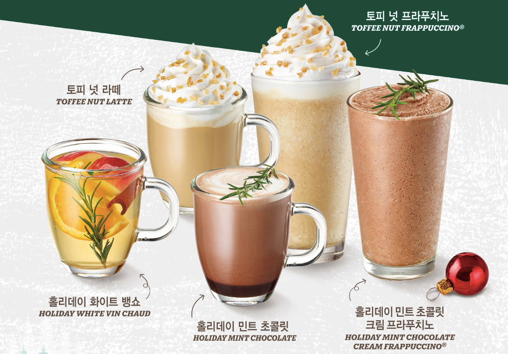 스타벅스 2019 크리스마스 e-프리퀀시 이벤트의 미션 음료는 리저브 음료 전체, 토피 넛 라떼, 토피 넛 프라푸치노, 홀리데이 민트 초콜릿, 홀리데이 민트 초콜릿 크림 프라푸치노, 홀리데이 화이트 뱅쇼와 11월 28일에 신규 출시되는 크리스마스 음료입니다.