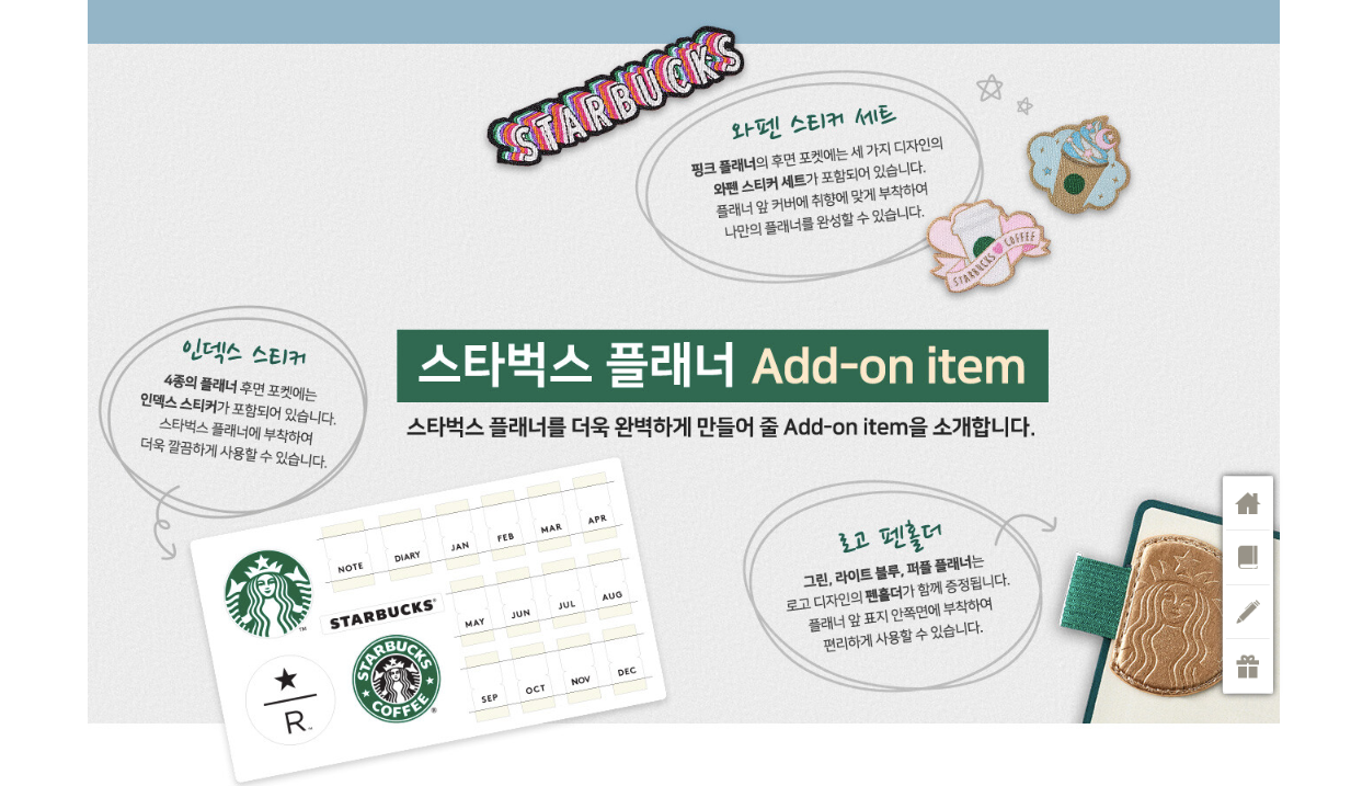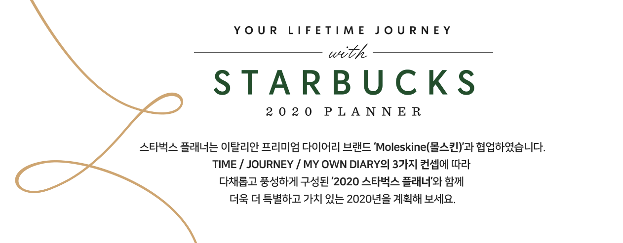 '2020 스타벅스 플래너'는 이탈리안 프리미엄 다이어리 브랜드 몰스킨(Moleskine)과 협업하여 TIME / JOURNEY / MY OWN DIARY의 3가지 컨셉에 따라 구성되어 있으며 스타벅스 플래너를 더욱 완벽하게 만들어줄 Add on Item인 와펜 스티커 세트, 인덱스 스티커, 로고 펜홀더가 같이 증정됩니다.