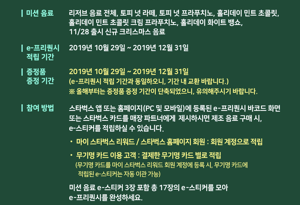 스타벅스 2019 크리스마스 e-프리퀀시 이벤트에 따른 e-프리퀀시 적립 기간은 2019년 10월 29일부터 12월 31일까지이며 올해부터는 증정품 증정 기간이 단축되어 e-프리퀀시 적립기간과 동일하니 반드시 기간 내에 교환해야 합니다.