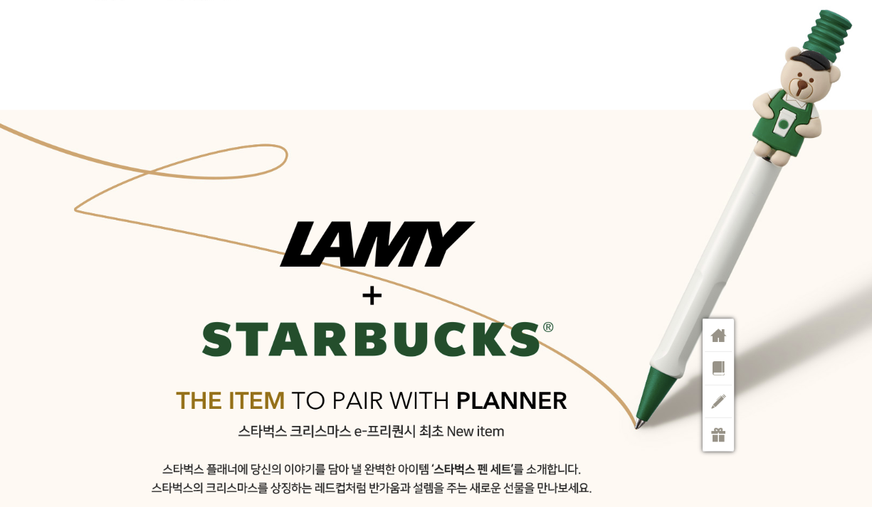 스타벅스 크리스마스 e-프리퀀시 최초 New item은 스타벅스와 독일 프리미엄 필기구 브랜드인 'LAMY'가 협업하여 만든 '스타벅스 펜 세트'로 스타벅스의 상징인 '컵'을 모티브로 한 틴케이스와 악세서리 2종(베어리스타, 스타벅스 사이렌 로고)이 포함되어 있습니다.
